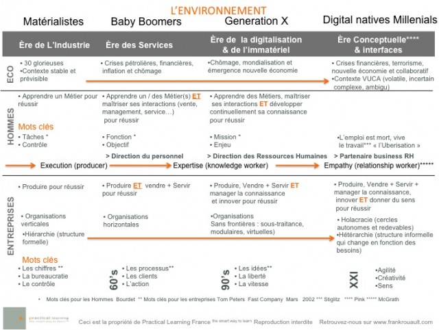A l’ère de l’industrie, il fallait apprendre un métier pour réussir, on parlait de tâches et de contrôle et les personnes étaient des « producteurs » centrés sur l’exécution. L’ère des services a apporté la nécessité non seulement d’apprendre un métier ET aussi de maitriser ses interactions avec les autres : management, vente, service, recrutement, parler en public… On parlait alors de fonction et d’objectif. L’ère de l’information a apporté la nécessité, en plus d’avoir un métier et maitriser ses interactions, de développer et manager continuellement ses connaissances pour réussir ; on parlait alors du travailleur de la connaissance et on avait des missions et des enjeux. L’ère conceptuelle a apporté une nouvelle dimension où il est clé, en plus, de parler à la tête et au cœur des gens pour réussir. On entend « l’emploi est mort, vive le travail », « l‘uberisation du travail » et on devient un travailleur de la relation.